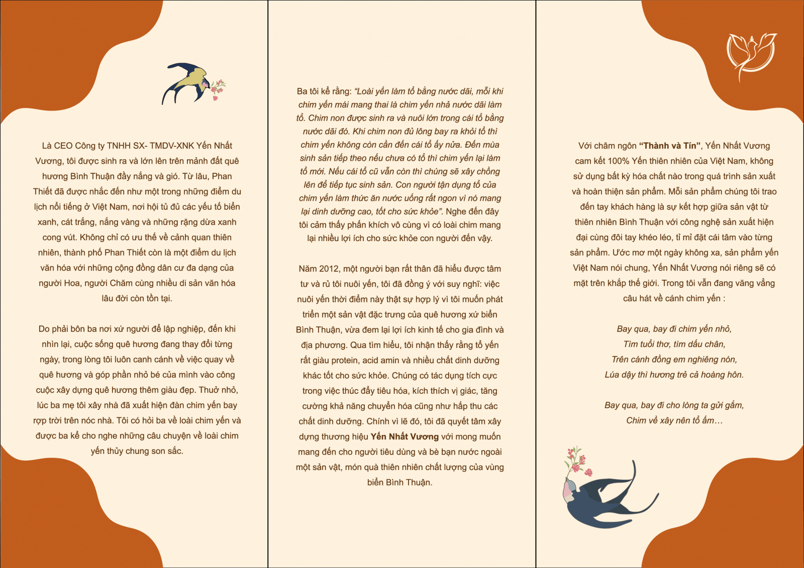 - Tâm huyết:Yến Nhất Vương đảm bảo thu hoạch yến nhân đạo, đảm bảo môi trường sống cho chim yến, phát triển mở rộng khu vực nuôi yến.